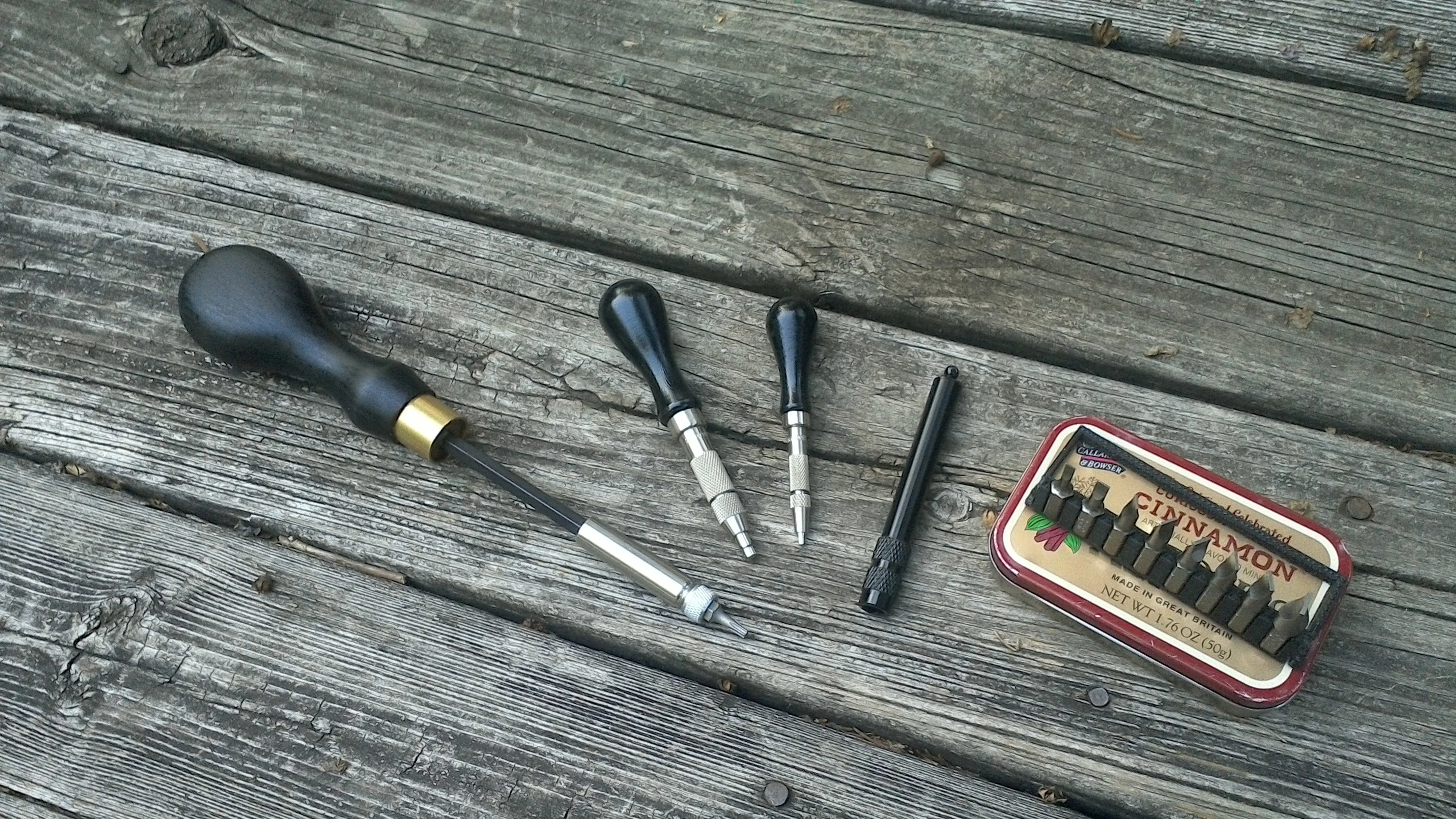 The thing is, to get a good fit, one needs a fair number of slotted screwdriver bits — here’s a photo of what I consider a minimum: